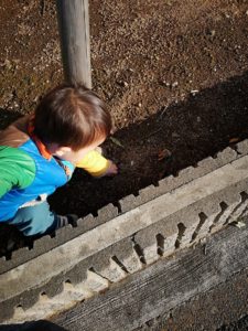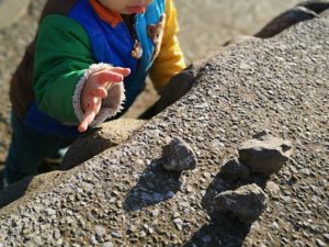 母「大きい石、3つ集めたね。1.2.3.3つあるね。」なんて、数の勉強もしてみたりしたところでそろそろ行くぞー。